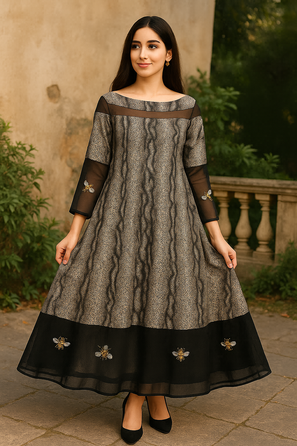 • Design: Snake print silk with black net borders and light bead embellishment