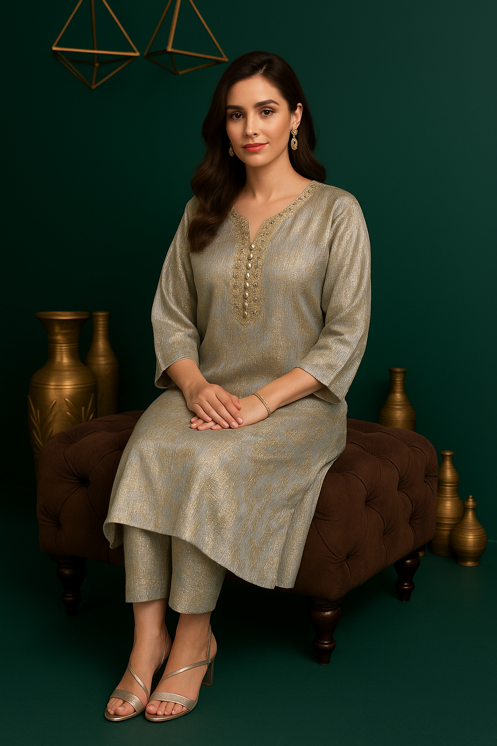 Dazzle with sophistication in this Slate & Silk collection design, crafted from luxurious crushed shimmer fabric. The shirt features a subtle silver and golden glow, exuding understated glamour perfect for festive evenings or semi-formal occasions. The mirrored lace neckline adds a modern, reflective detail, while delicate pearls on the sleeves bring a touch of timeless elegance. Designed with a coordinating slip for comfort and coverage, this piece strikes the perfect balance between sparkle and grace.